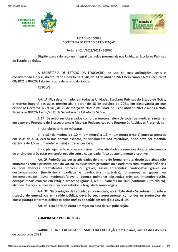 “Fica determinado, em todas as Unidades Escolares Públicas do Estado de Goiás, o retorno integral das aulas presenciais, a partir de 18 de outubro de 2021, em observância ao que dispõe os Decretos (…) e a Nota Técnica nº 08/2021 e 09/2021 da Secretaria de Estado de Saúde.”