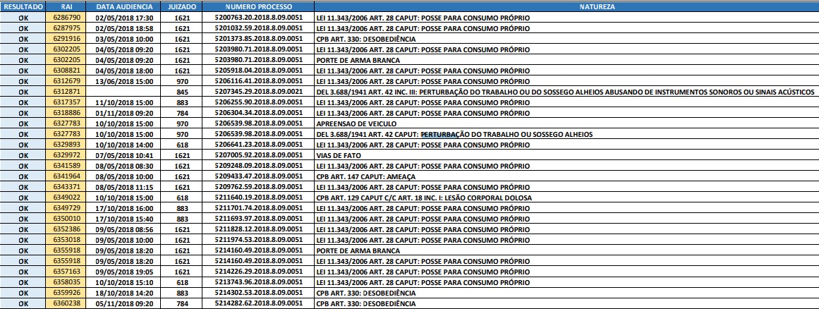 A lista ainda é engrossada por três registros de desobediência, dois de posse de arma branca, dois de perturbação do trabalho e sossego alheios, uma ameaça e um caso de vias de fato. Com auxílio de plantonistas como defensores públicos, promotores e juízes, processos já foram abertos contra os autores, os quais já possuem até audiência marcada para maio, junho, outubro e novembro.