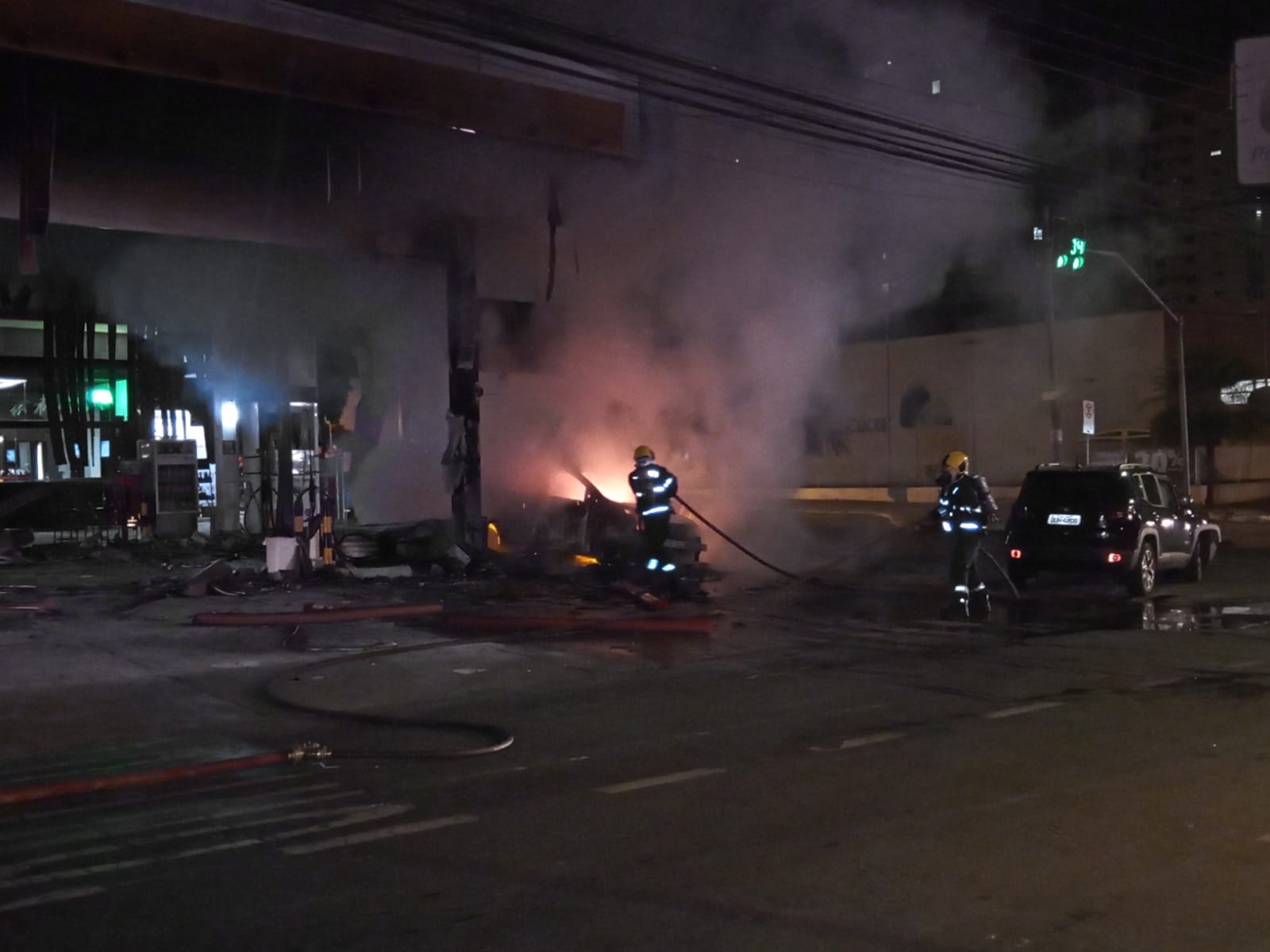 Posto de combustível fica destruído após incêndio causado por colisão entre carros