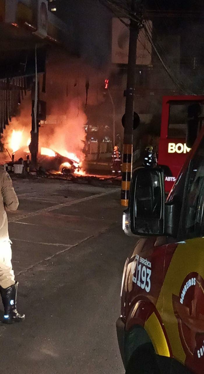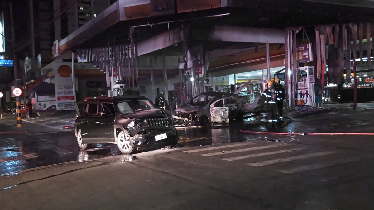 A área de abastecimento de um posto de combustíveis ficou completamente destruída após um incêndio causado depois de uma colisão entre dois carros, em Goiânia. O caso ocorreu no início da madrugada desta sexta-feira (9), no estabelecimento que fica no cruzamento da Av. T-63 com a T-15, no Setor Bueno, na capital.
