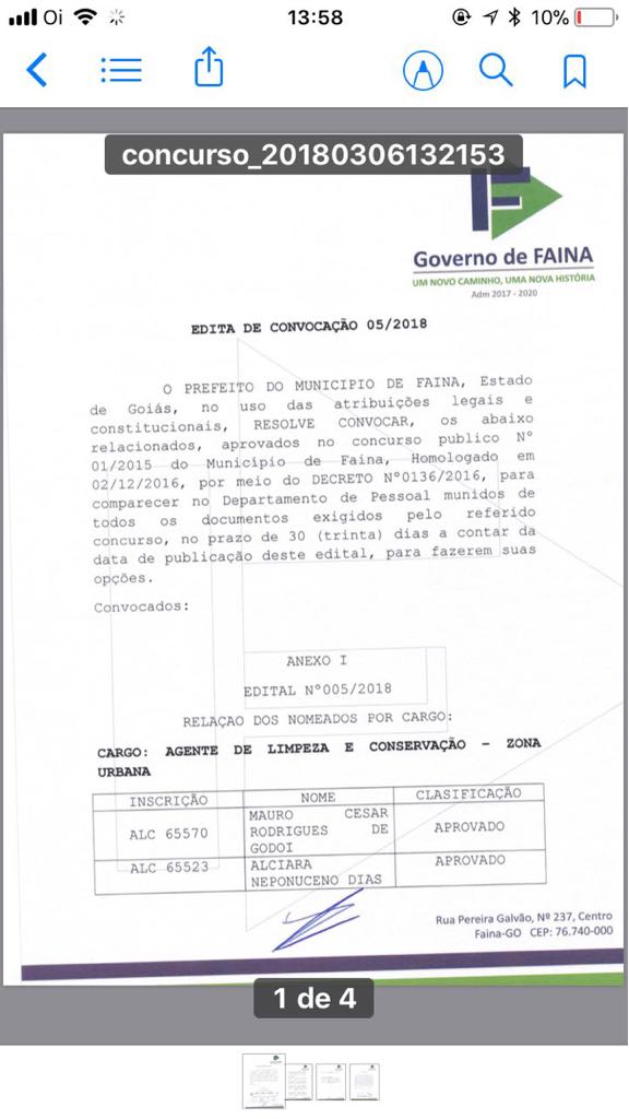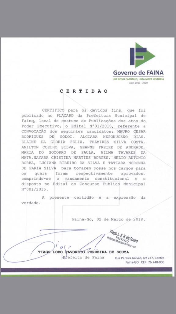 Na terça-feira (6), o Mais Goiás publicou matéria em que aprovados em concurso público homologado em 2015, mas realizado em 2016, acusam o prefeito da cidade de Faina Thiago Lobo Favoretto Pereira de Souza (DEM) de burlar decisão liminar que determina a demissão de comissionados e a consequente convocação de aprovados para ocupação dos respectivos postos. De acordo com o Ministério Público da Comarca de Goiás, a decisão estaria sendo descumprida pelo líder do Executivo municipal, o que gerou uma segunda sentença em desfavor do prefeito. Thiago, por outro lado, reforça que as exonerações foram feitas e que convocações estão sendo paulatinamente cumpridas, de acordo com as necessidades do município.