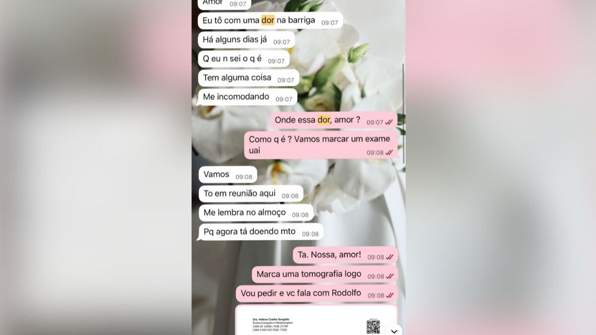 Helena relata que o marido começou a sentir dores abdominais há mais ou menos 20 dias, e que não eram dores constantes ou em pontos específicos – como geralmente ocorre em casos de apendicite, por exemplo. Ela diz que recomendou ao marido que fizesse uma tomografia, mas que ele não a fez porque a dor ia e voltava.