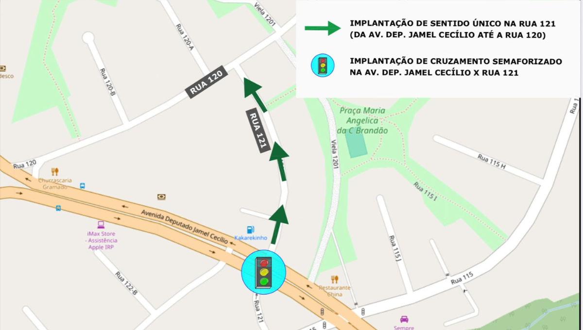 Na Rua 121, o trecho compreendido entre a Avenida Jamel Cecílio e a Rua 120 passa a ter sentido único, no fluxo da Avenida para a 120. Nesse ponto, foi implantado um cruzamento com semáforo.