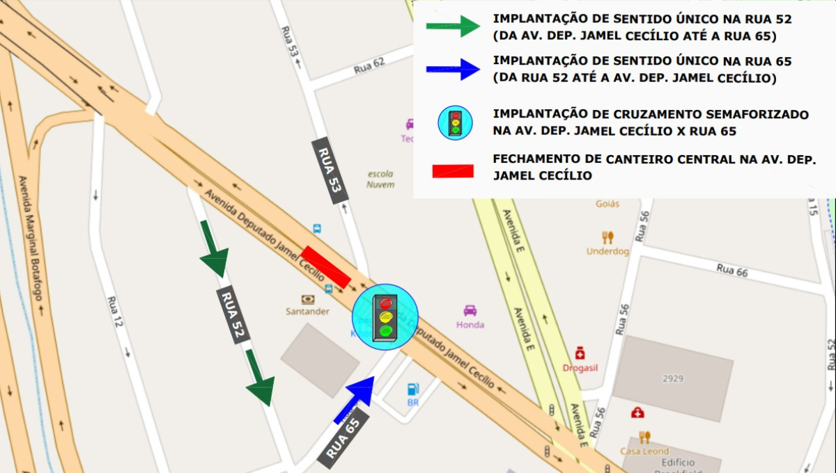 Outra modificação ocorre nas proximidades do Hotel K, onde a Rua 52, antes mão dupla, passa a ter sentido único da Avenida Jamel Cecílio para a Rua 65. Já esta terá o sentido invertido, com fluxo da Rua 52 para a Avenida. Neste ponto também foi implantado um cruzamento semaforizado, permitindo a quem sair da Rua 65 virar à direita ou à esquerda na Jamel Cecílio, além de acessar a quadra oposta pela Rua 53, no sentido Sul-Norte.