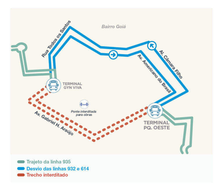 As linhas 932 (Terminal Vera Cruz / Terminal Goiânia Viva / Terminal Bandeiras) e 614 (Direto / Terminal Goiânia Viva / Terminal Bandeiras) também sofreram alterações por causa das obras. A RMTC comunicou que ambas serão desviadas, passando pelo Bairro Goiá sentido Terminal Goiânia Viva (confira na imagem abaixo).