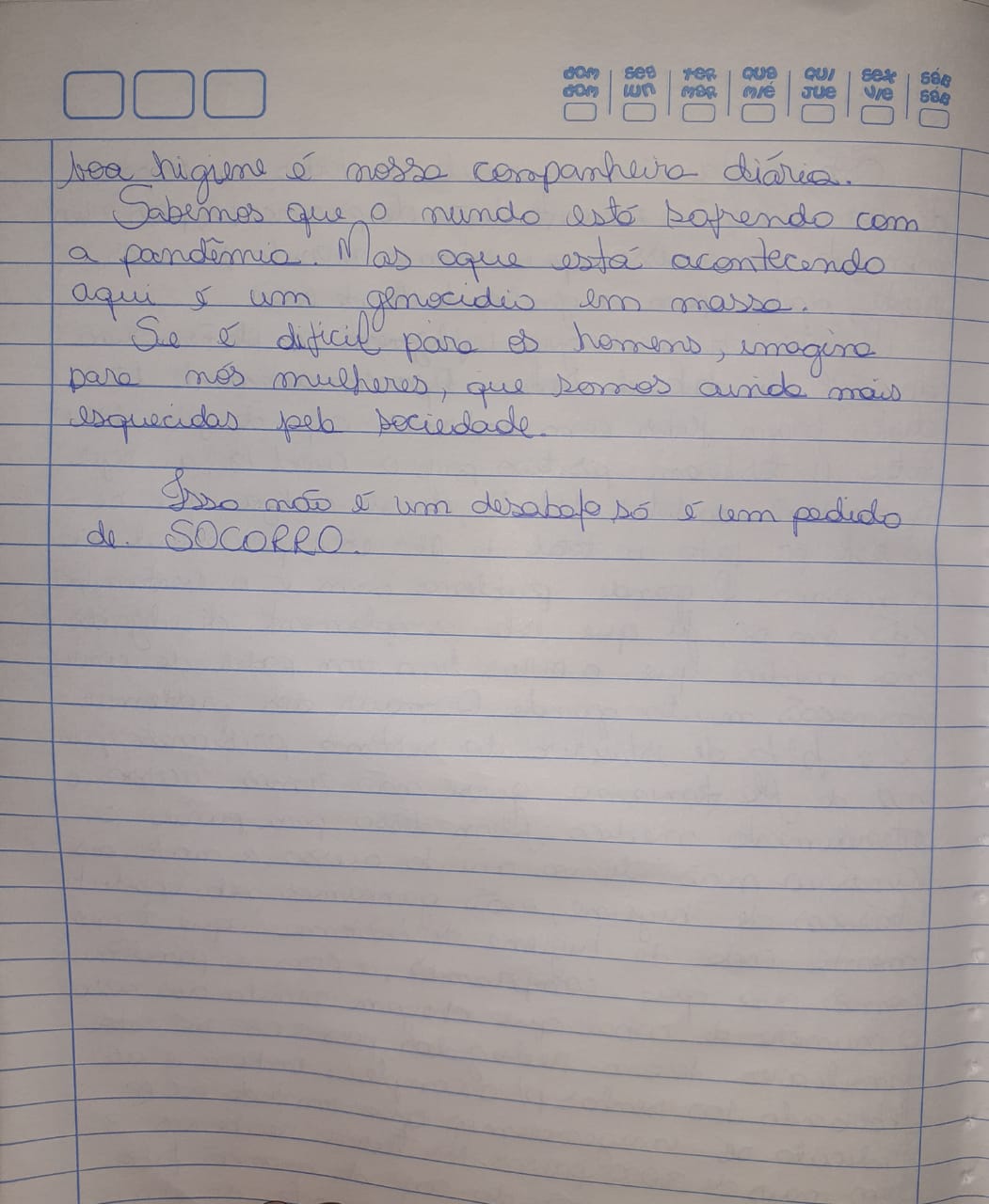 “Na teoria, recebemos três refeições, mas o pão do café da manhã falta quase que diariamente. A marmita do almoço e do jantar constantemente vem estragada. A falta de água, tão necessária para uma boa higiene, é nossa companheira diária”, pontua. Para finalizar, a detenta classifica como “genocídio em massa” o que está acontecendo dentro do presídio e encerrou com “isso não é um desabafo, é um pedido de socorro”.