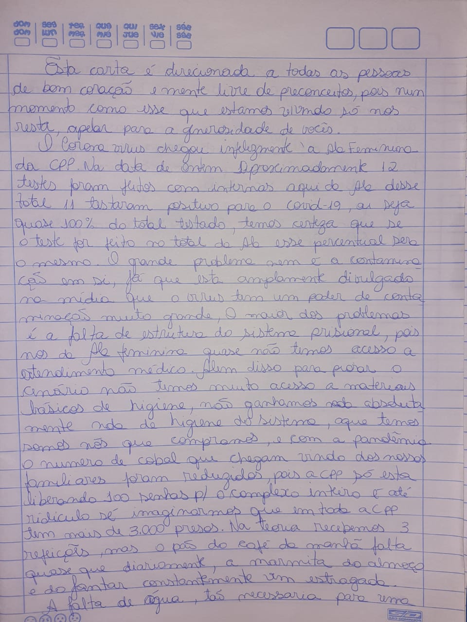 Em uma carta escrita a punho e endereçada a pessoas “de bom coração e mente livre de preconceitos”, detentas da Casa de Prisão Provisória (CPP) do Complexo Prisional de Aparecida de Goiânia fazem “pedido de socorro” em prol do combate à disseminação do novo coronavírus dentro da unidade. Segundo relato manuscrito, 11 entre 12 presas testadas receberam diagnóstico positivo para a Covid-19. “O grande problema é a falta de estrutura do sistema, pois nós, da ala feminina, quase não temos acesso a atendimento médico”, diz reeducanda não identificada em trecho. Para Ordem dos Advogados do Brasil (OAB), situação de necessidade é recorrente no sistema prisional.