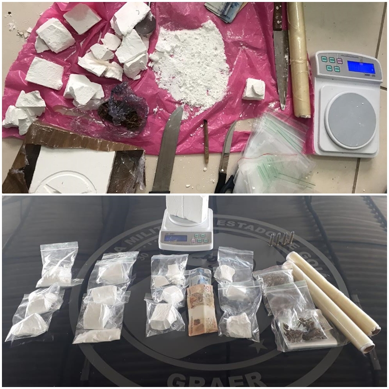 Durante patrulhamento, a equipe flagrou Hudson Kennedy Marcos Portella cortando e fracionando uma peça de cocaína. Segundo o Tenente Cunha, a peça, com alto teor de pureza, é conhecida como ‘escama de peixe’, sendo a pasta base do produto, e destinada ao tráfico ou à fabricação de outras drogas.