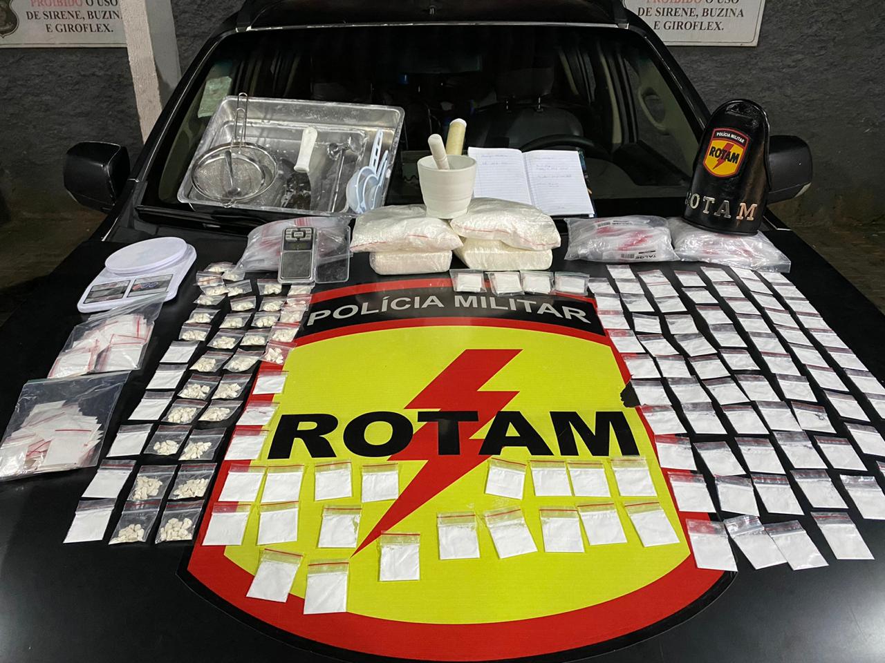 Ao todo, os militares apreenderam 293 porções, quatro peças maiores da droga, balança de precisão, material para corte, mistura e refino dos materiais. Os policias também apreenderam um carro e um celular.