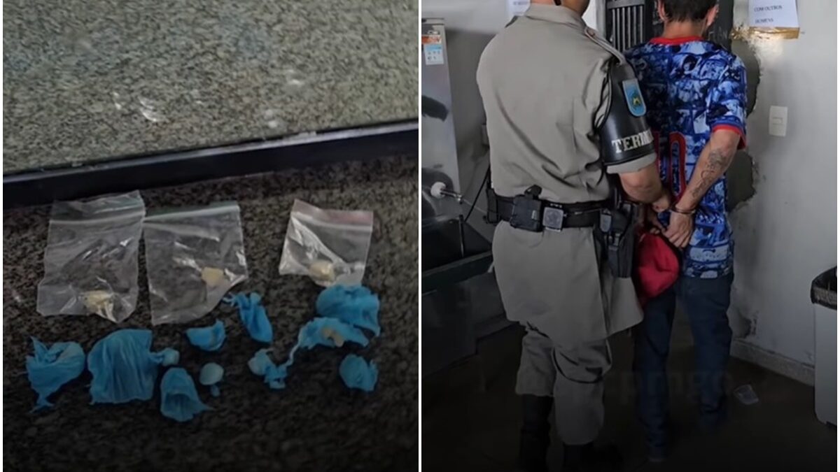Preso suspeito de tráfico que carregava porções de crack nos bolsos, em Goiânia (Fotos: Reprodução - PM)