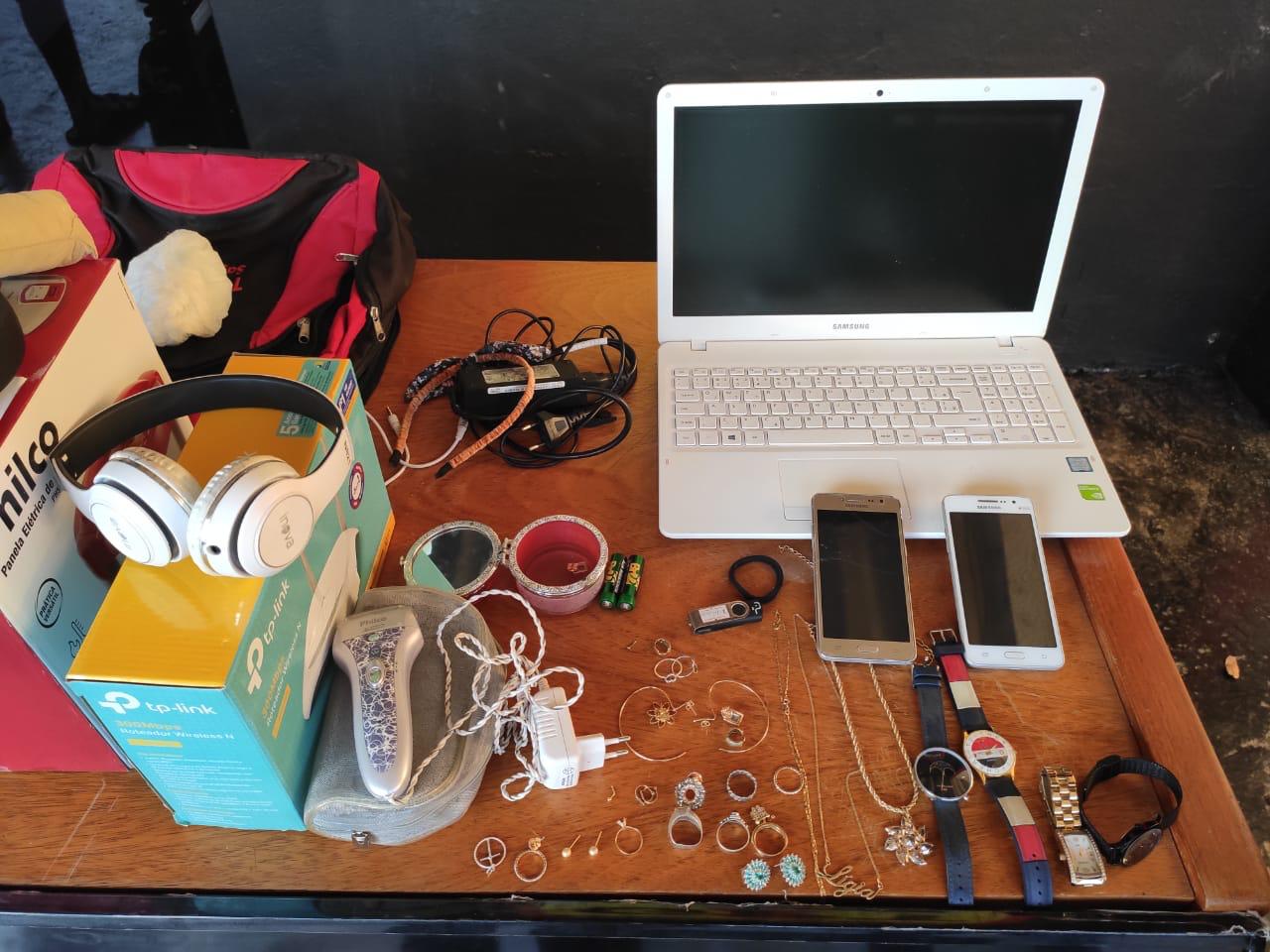 Os autores afirmaram que, após verificar que não havia moradores nas residências, eles pularam o muro e levaram diversos pertences dos imóveis. Com os suspeitos, foram encontrados objetos como celulares, relógios, perfumes, bonés, notebook, videogames, televisão, furadeiras e até panela elétrica. Durante a ação, também foram apreendidos uma moto usada nos crimes e R$ 467 em espécie.