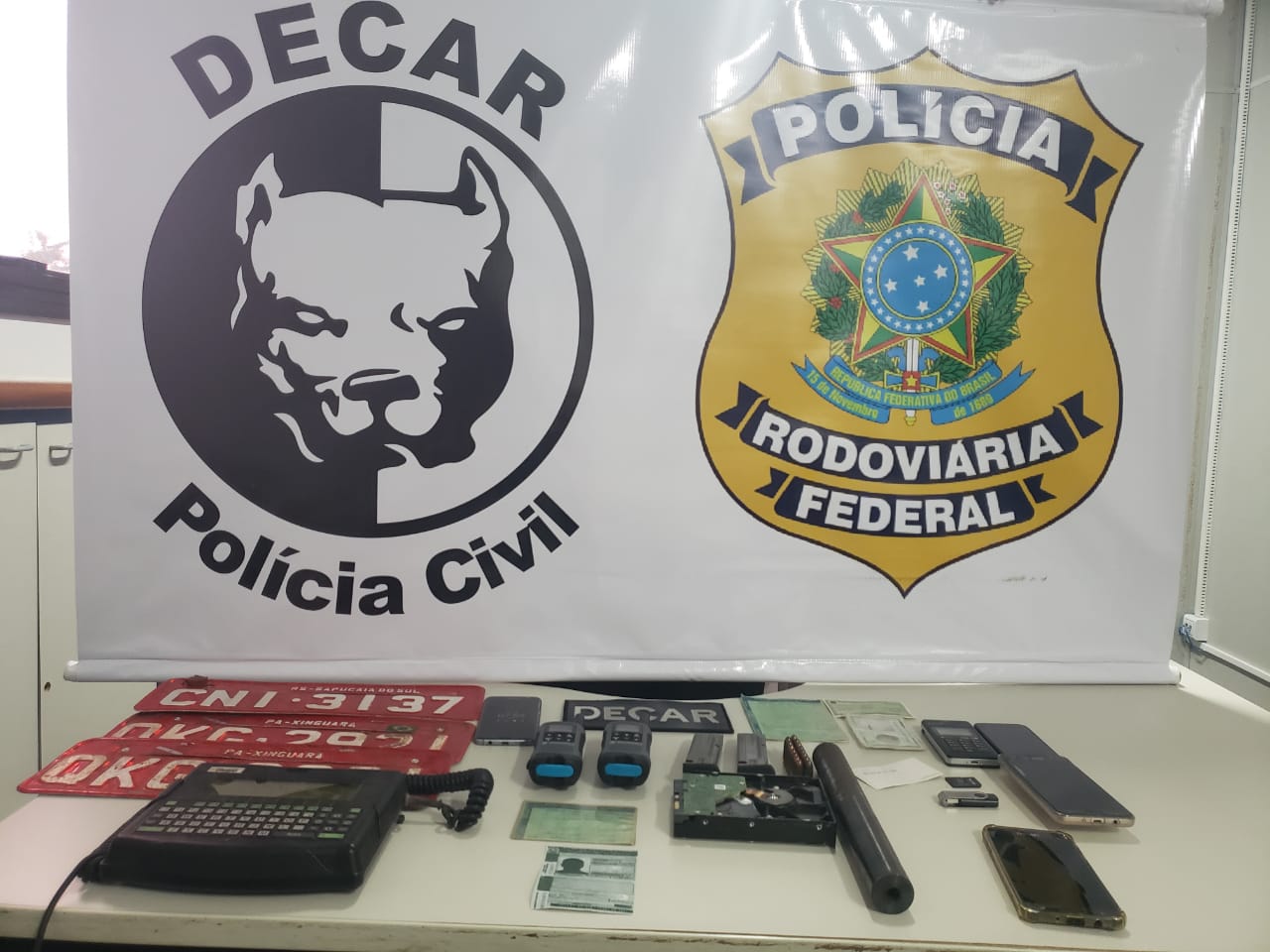 Segundo informações da Polícia Civil (PC), a organização era investigada há seis meses. Quatro mandados de busca e apreensão foram cumpridos em Goiânia e Anápolis e resultaram na prisão de Rodrigo Fernandes Goulão de Almeida, Marco Aurélio Carvalho e Adonias Cunha dos Santos. Quarto suspeito identificado como Alessandro Pereira da Silva não foi encontrado pela polícia. Nas residências dos suspeitos, os agentes apreenderam placas de caminhão roubado, documentos falsos e radiocomunicadores.