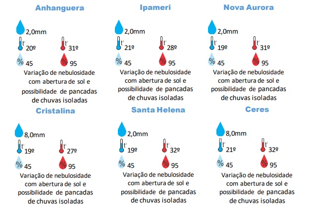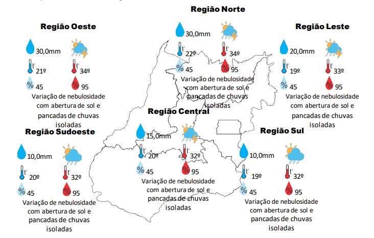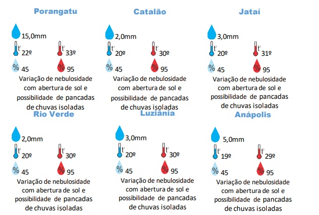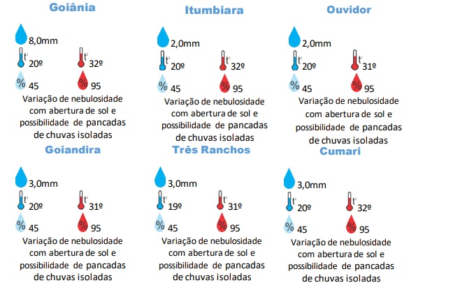 Para Goiânia, a previsão é de variação de nebulosidade com abertura de sol e possibilidade de pancadas de chuvas isoladas. A temperatura máxima pode chegar a 32°C e umidade relativa do ar com variação entre 45% e 95%.