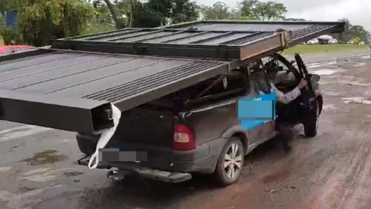 Depois da fiscalização, a PRF multou o condutor e retirou a carga. O automóvel ficou retido no posto da Polícia Rodoviária Federal até outro veículo para transporte de cargas de grande porte chegar para levar o portão.