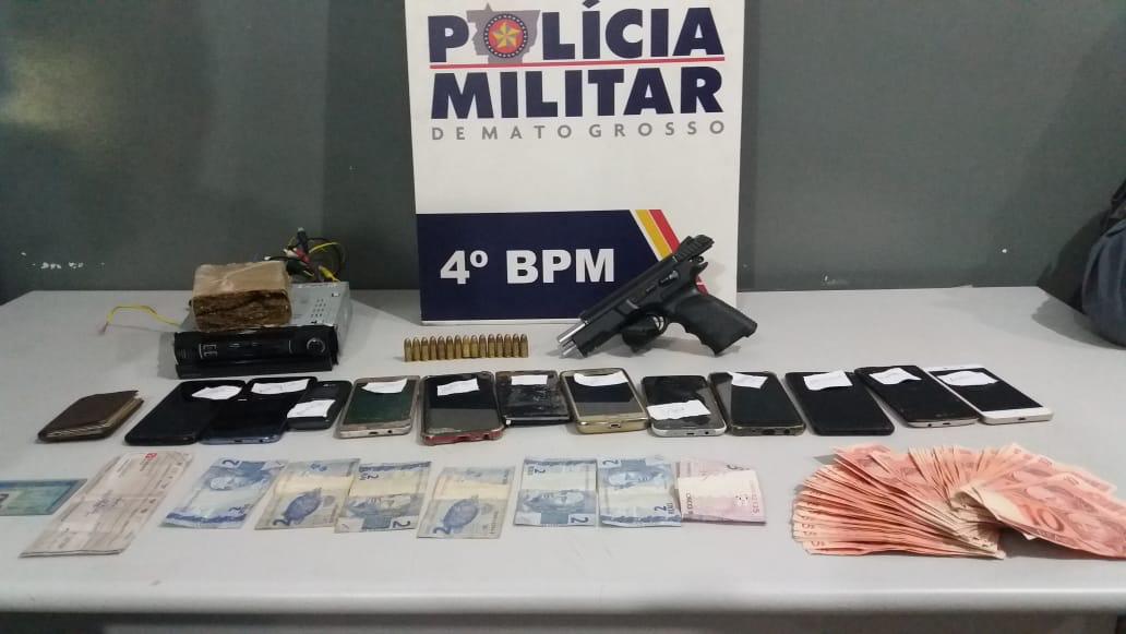 Com os detidos, os militares apreenderam uma arma de uso restrito, rádio digital, 13 celulares e uma quantia não revelada em dinheiro. O bando, formado por cinco homens e quatro mulheres foi conduzido à Central de Flagrantes de Várzea Grande.