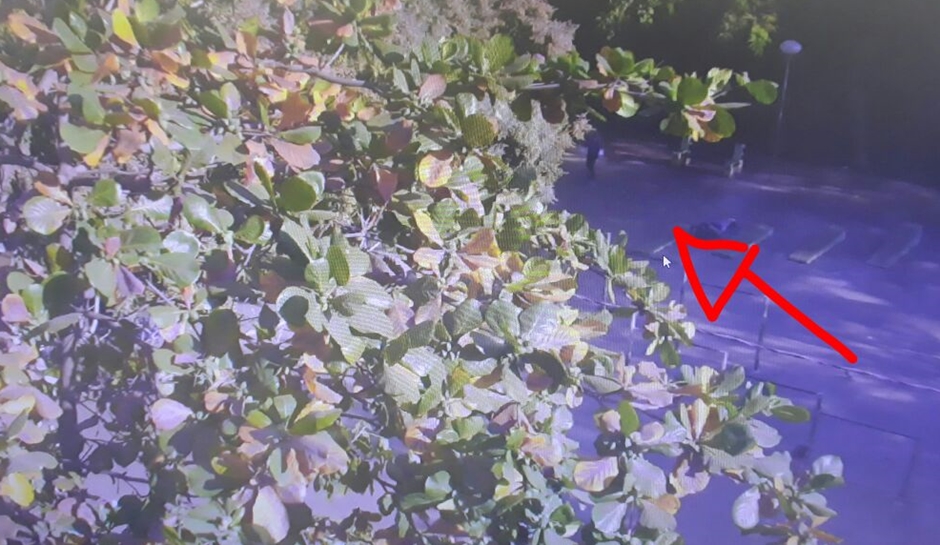 Imagem da câmera de monitoramento está encoberta por uma árvore no local em que o vândalo agiu. (Foto: GCM)