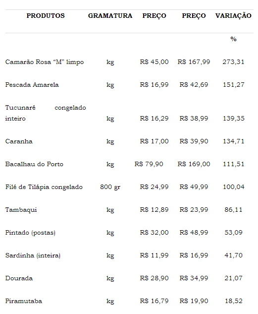 Ainda conforme o Procon, alguns populares como pescada amarela, tucunaré inteiro, caranha e bacalhau do porto tiveram variação no preço acima de 100%. O peixe cujo preço menos variou foi a piramutaba: o quilo mais barato foi encontrado na capital a R$ 16,79 e o mais caro, a R$ 19.