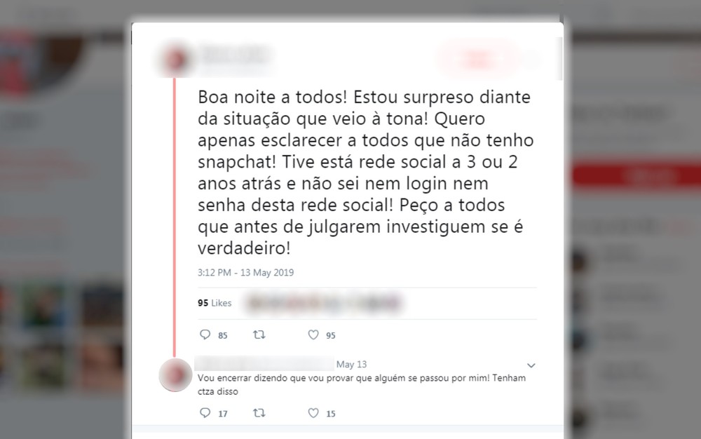 Também por meio de redes sociais, o professor se pronunciou e afirmou estar surpreso com as denúncias. “Quero esclarecer a todos que não tenho snapchat! Tive a rede social a 3 ou 2 anos atrás e não sei nem login nem senha desta rede social. Peço a todos que antes de julgarem investiguem se é verdadeiro”, diz trecho da postagem.