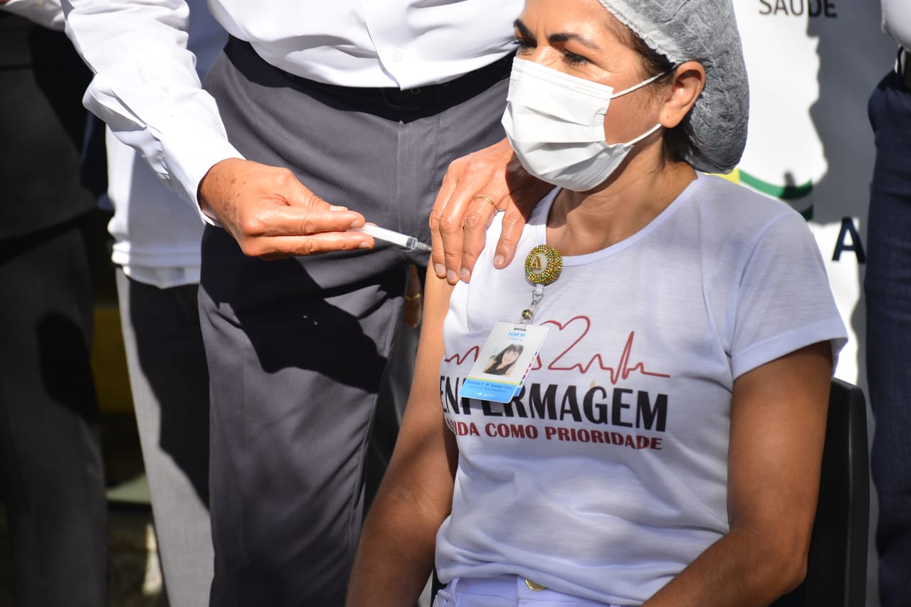 No primeiro ato de vacinação na cidade, os imunizados foram a técnica em enfermagem Antônia Francisca Monteiro Bastos Silva, de 48 anos; o motorista do Samu Sandro Vieira Coelho, 48, e a profissional da limpeza Joselina da Cruz Tavares Rodrigues, 57.