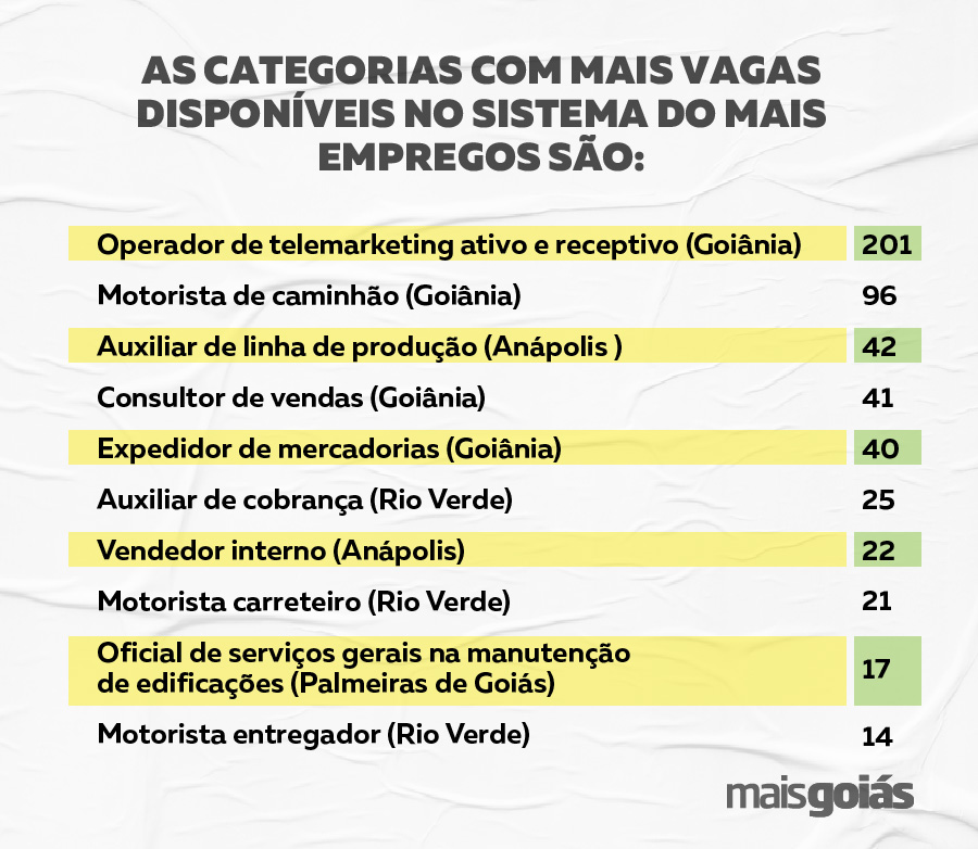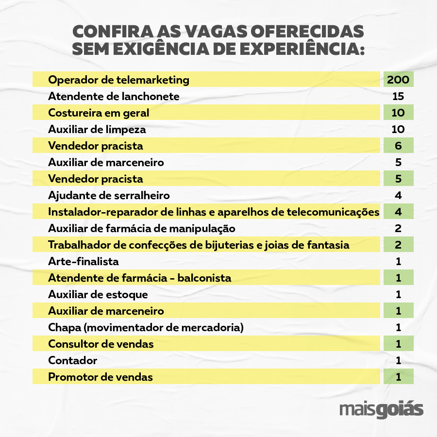 Dessas vagas, 271 não exigem experiência do candidato e 92 são destinadas a pessoas com deficiência. As ofertas de trabalho abrangem diversos cargos, como vigilante, auxiliar de limpeza, empacotador, auxiliar de almoxarifado e auxiliar de linha de produção. Em Goiânia, por exemplo, 200 vagas de teleoperador requerem contratações imediatas.