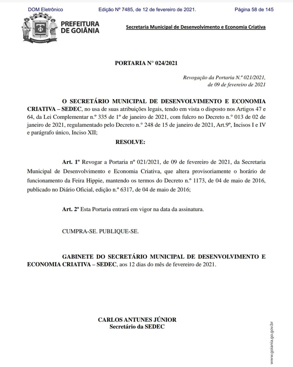 “Mantivemos um diálogo constante com os feirantes que reviram pedido anterior. Então a Prefeitura atende o pedido deles mais uma vez”, disse, também nesta sexta, Carlos Júnior, titular da Secretaria de Desenvolvimento e Economia Criativa (Sedec), que assinou o documento.