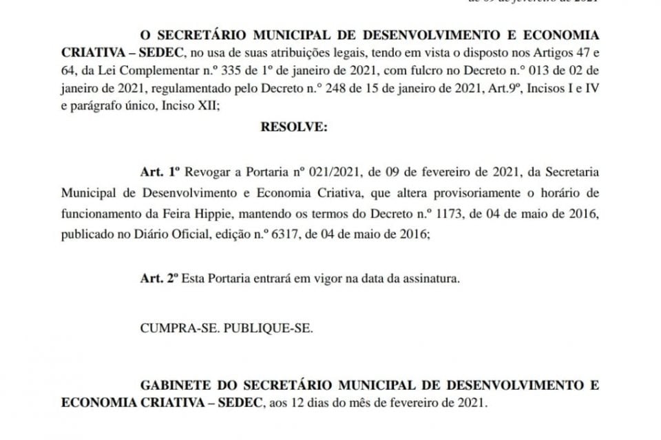 “Mantivemos um diálogo constante com os feirantes que reviram pedido anterior. Então a Prefeitura atende o pedido deles mais uma vez”, disse, também nesta sexta, Carlos Júnior, titular da Secretaria de Desenvolvimento e Economia Criativa (Sedec), que assinou o documento.