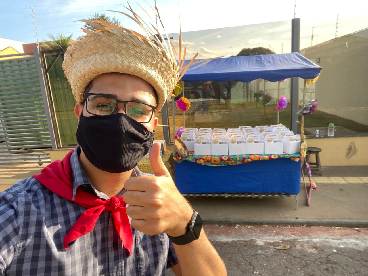 O publicitário goiano Sávio Martins, de 25 anos, transformou o seu aniversário em ocasião para ajudar uma instituição que cuida de famílias carentes, chamada Projeto Cata-Vento. Ele inventou uma festa em formato drive-thru, na qual os convidados deveriam passar de carro – sem descer – na barraca que ele montou, deixar o leite doado e receber em troca o que ele chamou de “kit junino” (veja na foto).