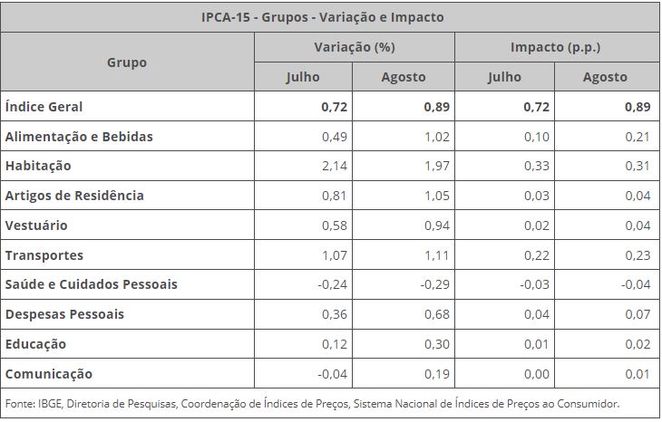 No cenário nacional, a variação do IPCA-15 foi de 0,89% – a maior variação para um mês de agosto desde 2002, quando o índice foi de 1,00%, segundo o IBGE. Para o cálculo do IPCA-15, os preços foram coletados entre 14 de julho e 13 de agosto de 2021 e comparados aos vigentes de 15 de junho a 13 de julho de 2021. O indicador refere-se às famílias com rendimento de 1 a 40 salários mínimos das cidades de Goiânia, Rio de Janeiro, Porto Alegre, Belo Horizonte, Recife, São Paulo, Belém, Fortaleza, Salvador e Curitiba, além de Brasília.
