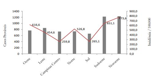 Em relação às taxas de incidência por região da cidade, a Noroeste é que conta com a maior: 773,6 a cada 100 mil habitantes. Em seguida estão as regiões Sudoeste (651,1 casos); Oeste (616,6 casos); Norte (526,8 casos); Leste (454,6 casos); Sul (265,1 casos) e Campinas Centro (259,8 casos a cada 100 mil habitantes). Conforme a SMS, “as regiões Noroeste, Sudoeste, Oeste, Norte e Leste registram incidências acima de 300 casos a cada 100 mil habitantes indicando alto risco para a ocorrência de dengue, conforme parâmetros estabelecidos pela SVS/MS”.