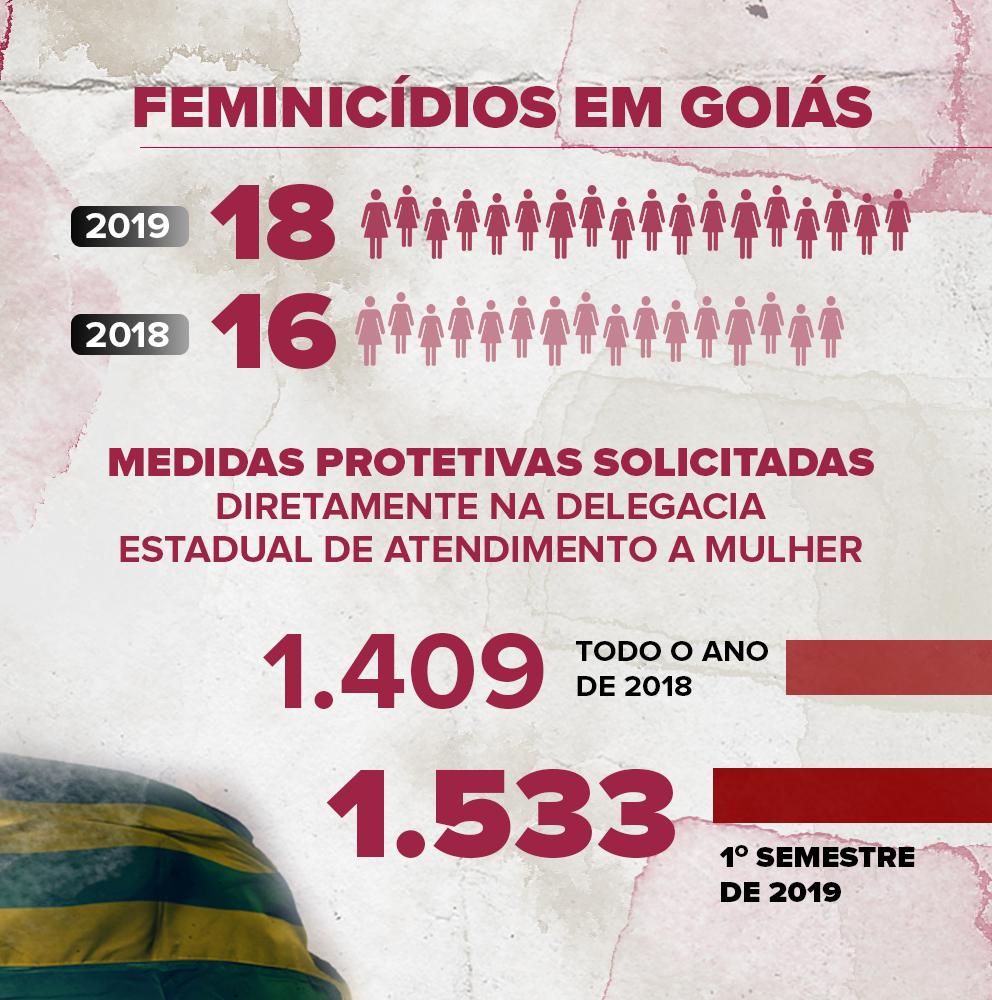 Em Goiás, o número de ocorrências registradas por crimes de violência doméstica aumentou 84,6% em 2019. Segundo dados da Secretaria de Segurança Pública do Estado de Goiás (SSP-GO), foram 2.2 mil registros a mais que o mesmo período de 2018 (2,6 mil). Este número, porém, não significa um aumento na prática do crime, e sim que as vítimas de relacionamentos abusivos estão procurando ajuda.