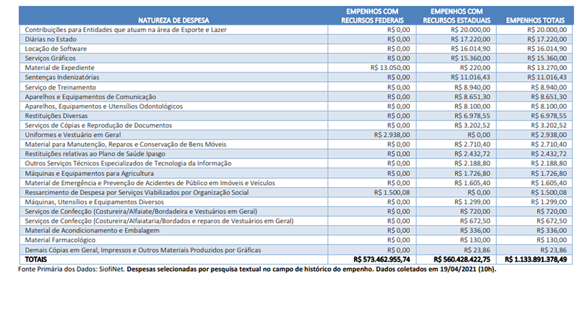 Deste valor, foram empenhados 255.143.613,98 de recursos federais e R$ 212.730.984,94 de estaduais. Somando todos as despesas, o montante de empenhos é de R$ 1.133.891.378,49.