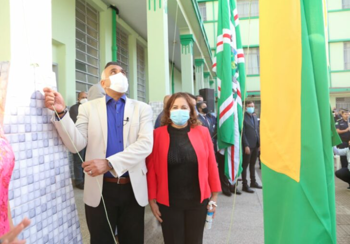 Prefeito Rogério Cruz ao lado da primeira-dama, Thelma, em cerimônia no colégio Santa Clara, em Campinas (Foto: Jackson Rodrigues/Prefeitura de Goiânia)