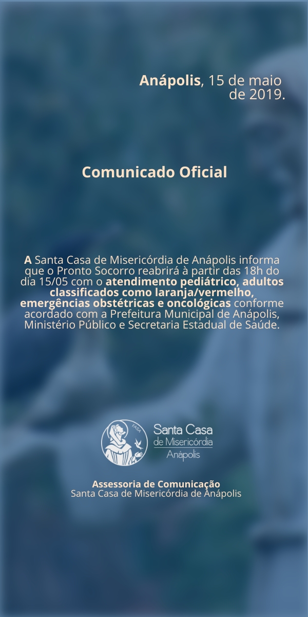 A Santa Casa de Misericórdia de Anápolis emitiu um comunicado informando a normalização dos atendimentos de urgência e emergência na unidade, a partir de 18 horas, desta quarta-feira (15). Na última terça-feira (14), o hospital havia paralisado os atendimentos alegando atrasos nos repasses do governo estadual. O anúncio ocorreu após uma reunião entre a diretoria da Santa Casa de Anápolis e o secretário de Estado de Saúde, Ismael Alexandrino, na manhã de quarta-feira (15).