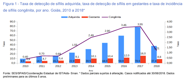 Os registros do Sistema de Informação de Agravos de Notificação (Sinan) de sífilis adquirida, sífilis em gestantes e sífilis congênita, atualizados em série histórica até 30 de julho de 2017, apontam que em Goiás, nos últimos 5 anos, houve um aumento de notificação de casos da doença (veja gráfico abaixo). Segundo os profissionais da área, esse crescimento da doença no Estado pode ser atribuído ao aprimoramento do sistema de vigilância epidemiológica, à redução do uso de preservativo, à resistência dos profissionais de saúde na administração de penicilina na Atenção Básica e ao aumento da cobertura de testagem com a ampliação da distribuição de testes rápidos.