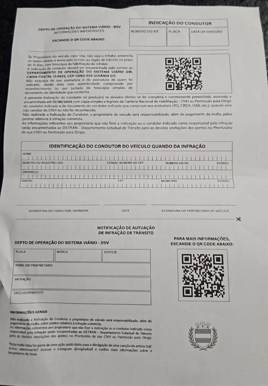 Essas supostas multas orientam o motorista a escanear o código para “visualizar ou pagar” o débito. No falso documento não está registrado o motivo da infração. Ele é apenas um papel com um código e apenas informa que, se o motorista não é o autor da infração, é necessário preencher os dados e informar o condutor responsável.
