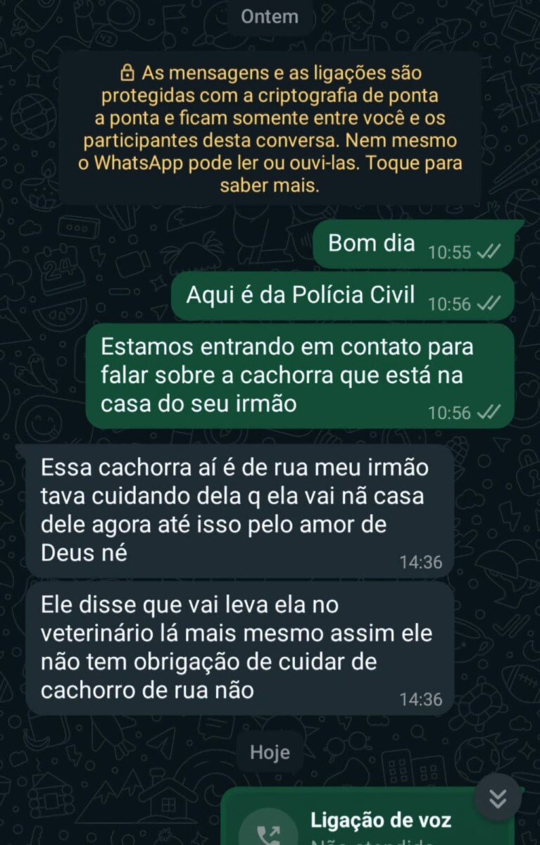 Contudo, na terça-feira (5), ele entrou em contato com o Grupo de Proteção Animal (GPA) da Polícia Civil e disse que não iria levar a cadela ao UPAVET, pois ela era do irmão dele. O GPA, então, entrou em contato com o parente do suspeito, por mensagem, e ele disse que o cão era de rua e que os dois não tinham obrigação de levar ao veterinário.