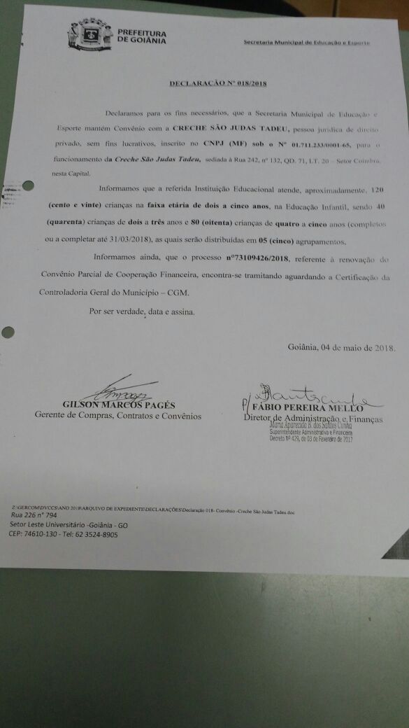 A Secretaria Municipal de Educação e Esporte (SME) informa que o processo de convênio da Creche São Judas Tadeu está em fase de certificação na Controladoria Geral do Município e que, assim que estiver devidamente certificado, será feito o repasse à instituição. A SME destaca, ainda, que este é um trâmite legal que deve ser cumprido pela Prefeitura de Goiânia.