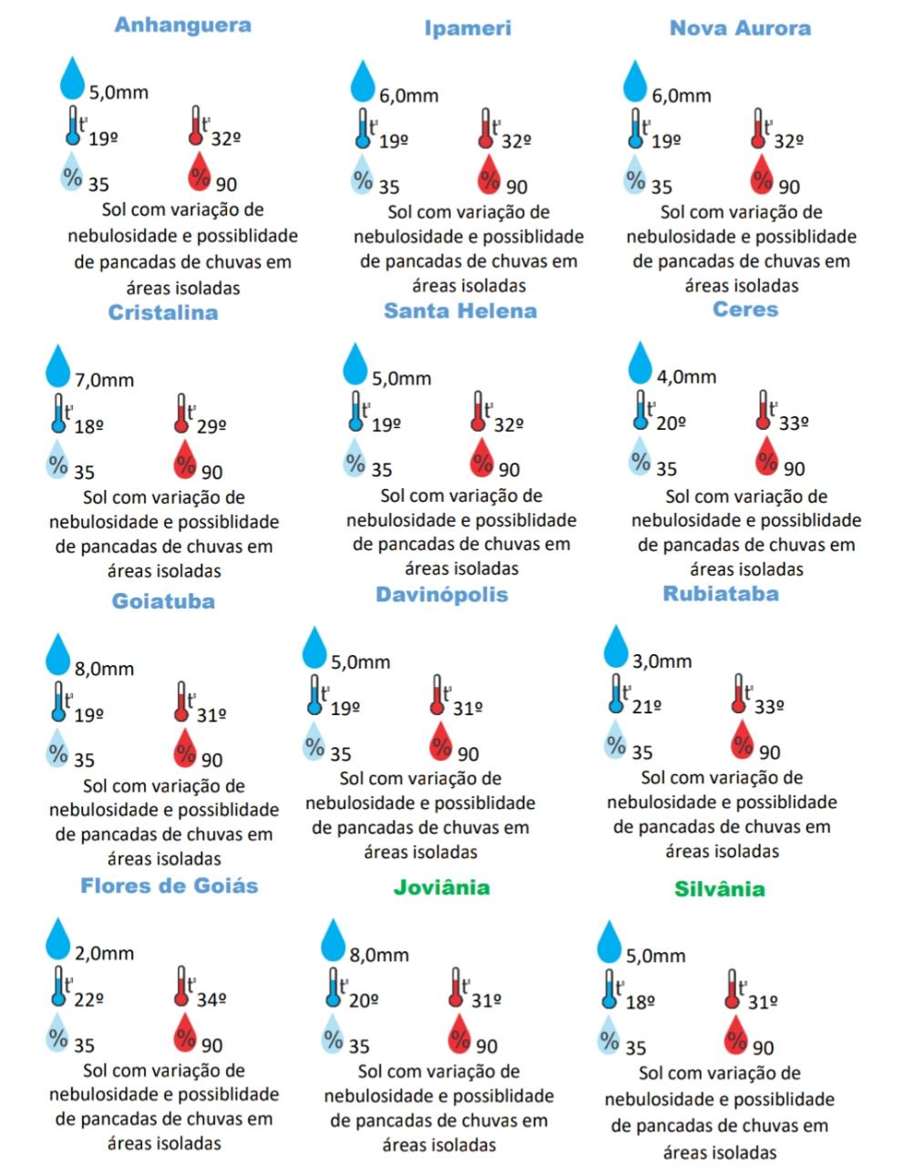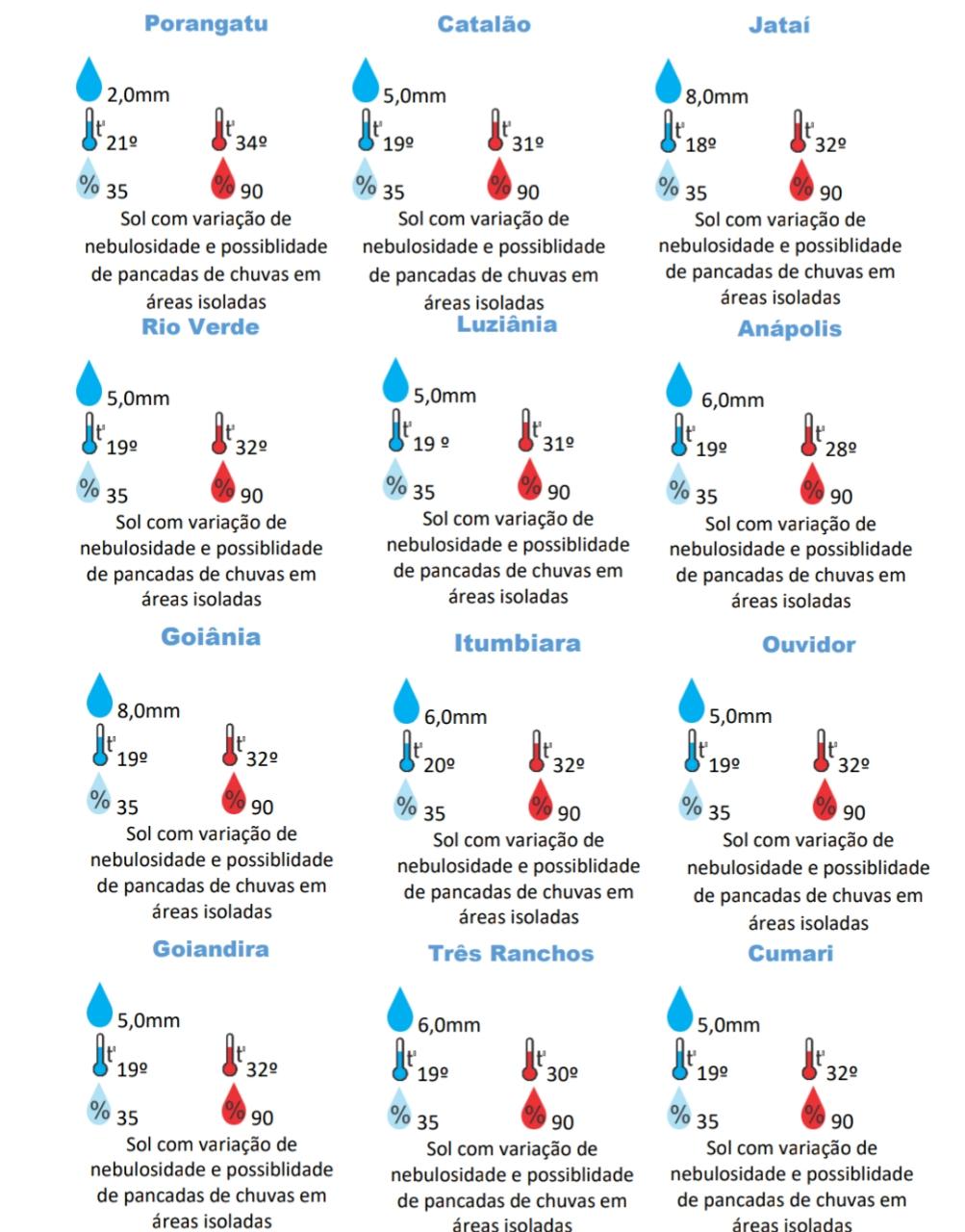 Na região oeste de Goiás a previsão é de sol com máxima é de 35°C, com variação de nebulosidade e possibilidade de pancadas de chuvas em áreas isoladas. Para a região leste, a previsão é de sol com mínima de 18ºC e máxima de 34°C, possibilidade de chuvas em áreas isoladas. Já as regiões sul e sudoeste de Goiás, a temperatura mínima é de 18°C e a máxima de 33°C com possibilidade de chuvas.