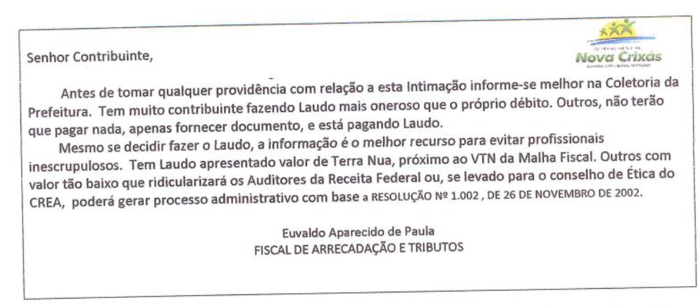 Os crimes passaram a ser investigados depois que o Sindicato Rural de Nova Crixás denunciou o caso à Polícia. Segundo o advogado da entidade, Breno Caiado, a prefeitura faz, anualmente, tabela do valor da terra nua, isto é, terras sem benfeitorias. Em 2019, porém, o valor cobrado seria acima da realidade de mercado.
