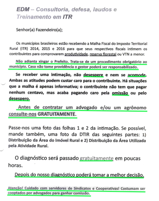 Ao procurarem a Prefeitura para tratar sobre o ITR, as vítimas eram obrigadas a falar com Sinomar, que afirmava ter sido contratado para negar eventuais defesas dos proprietários de terras e “derrubar” laudos. O servidor apontava como única saída “recursos administrativos”, que na verdade seriam julgados e deferidos por ele em caso de pagamento particular.