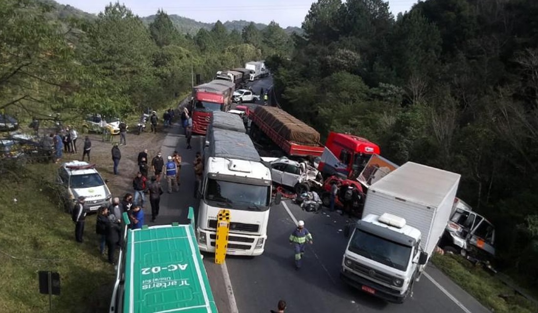 Após o acidente envolvendo um time de futsal na manhã desta quinta-feira (8), uma outra colisão ocorreu na BR-376 em Tijucas do Sul, no Paraná, no quilômetro 660 por volta das 9h40. O novo engavetamento envolveu 10 veículos e deixou sete pessoas feridas, de acordo com a PRF (Polícia Rodoviária Federal). Os feridos foram encaminhados para o Hospital São José, em Joinville (SC), e para o Pronto Atendimento de Garuva (SC).