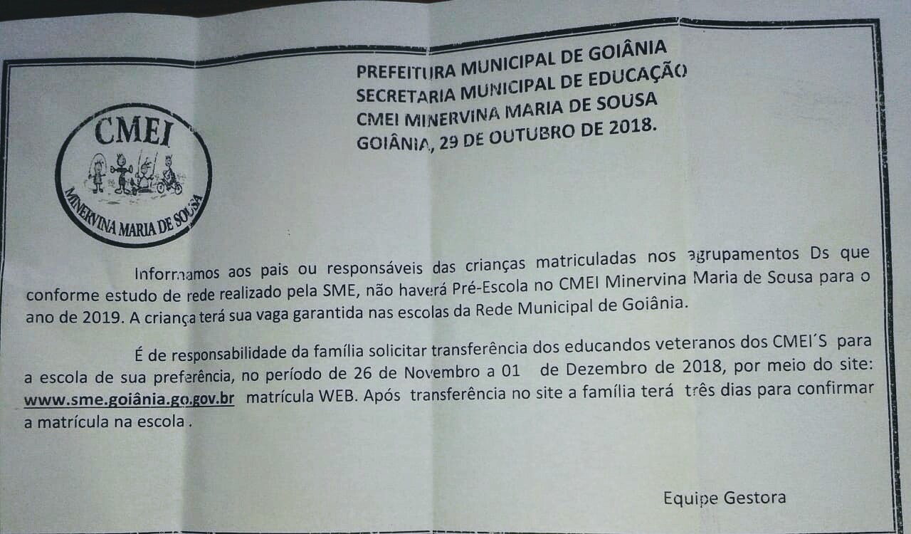 “De acordo com o Plano Nacional de Educação, é dever do poder público ampliar a oferta de vagas para crianças de 0 a 3 anos em creches. Já a Proposta de Emenda à Constituição nº 59/2009 coloca o atendimento de crianças de 4 e 5 anos como parte da Educação Básica obrigatória. Os esforços da SME em realocar os alunos de pré-escola visam a ampliar a oferta de vagas para a faixa etária que apresenta a maior demanda manifesta. O atendimento às crianças realocadas já está previsto nas instituições com Educação Infantil mais próximas, cabe aos responsáveis somente a realização da transferência do aluno, que é feita online, por meio do Portal da Secretaria Municipal de Educação e Esporte. Os pais estão sendo comunicados das mudanças de forma gradativa e a vigência será para o início do ano letivo de 2019, previsto para o final de janeiro”, diz o texto.