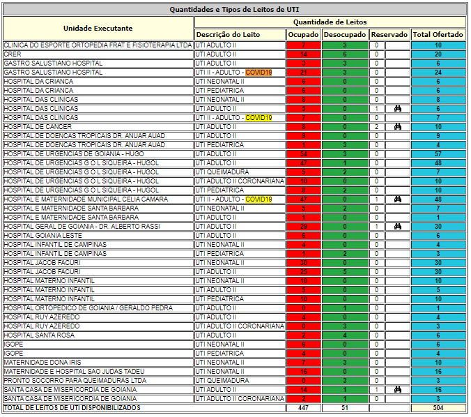 No geral, Goiânia possui 504 leitos de UTI. São 447 ocupados no momento e 51 disponíveis. A diferença fica por conta dos reservados.