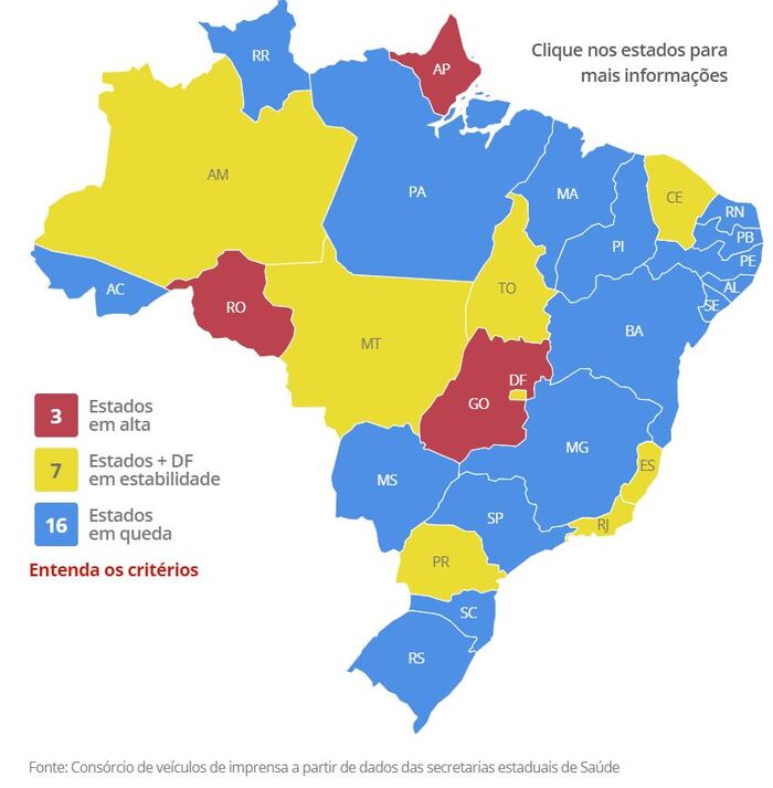 O G1 aponta que a maioria dos Estados apresenta queda no número de mortes por Covid. São eles: Mato Grosso do Sul, Rio Grande do Sul, Minas Gerais, Bahia, Maranhão, Pará, Piauí, Santa Catarina, Sergipe, Alagoas, Pernambuco, Paraíba, Rio Grande do Norte, São Paulo, Acre e Roraima – 16 ao todo.