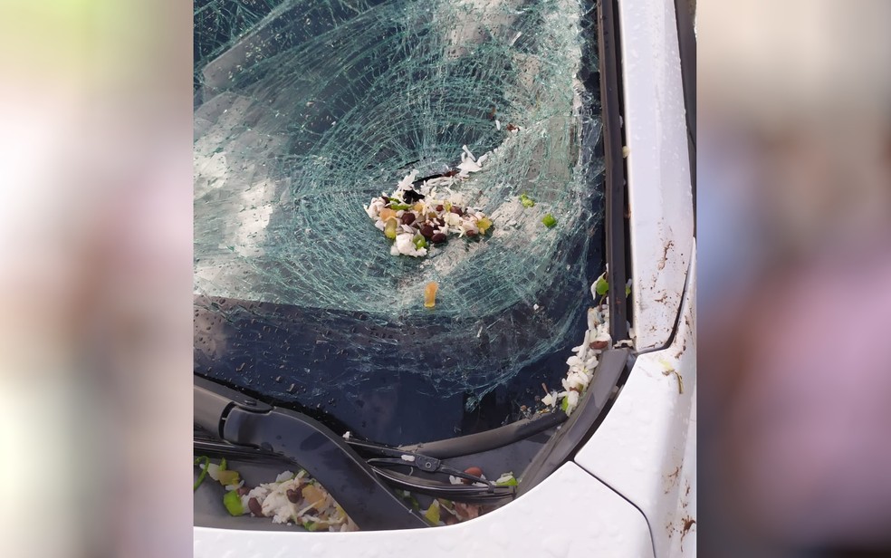 Com o choque, a comida da marmita das duas irmãs ficou espalhada pelo vidro do carro.