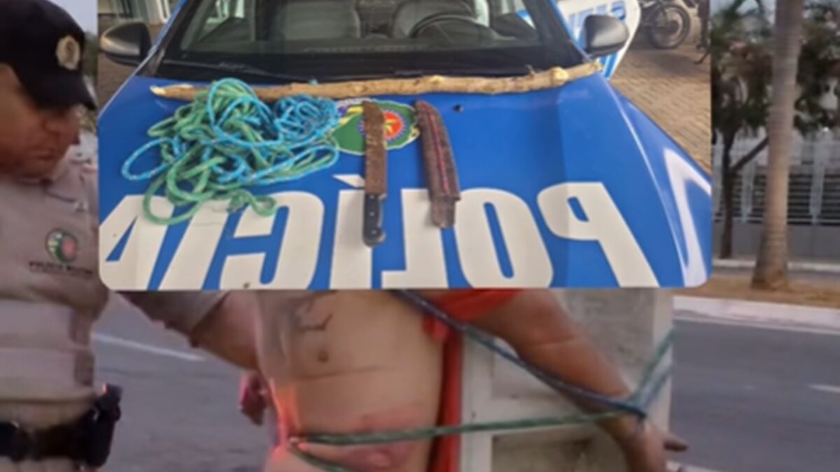 Depois de apanhar de populares e ficar com vários ferimentos no corpo, o homem foi amarrado com cordas em um poste. Em seguida, a Polícia Militar (PM) foi acionada.