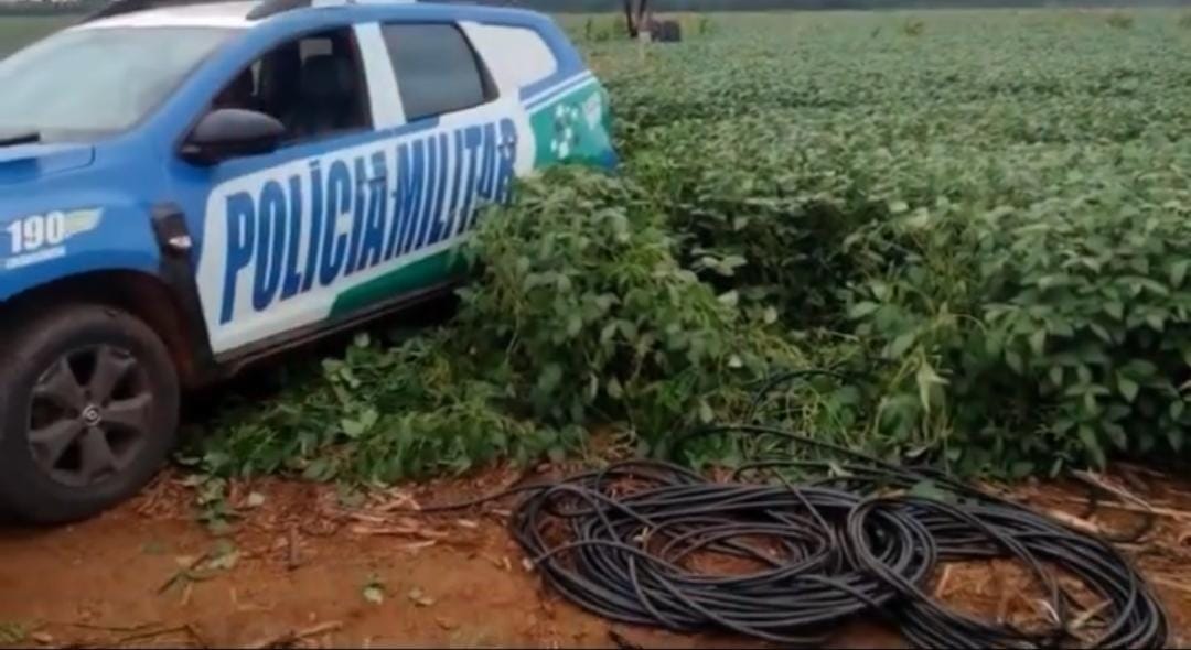 De acordo com a corporação, a equipe foi acionada por uma rede de monitoramento de pivô. A PM foi informada de que uma propriedade rural tinha sido vítima de rompimento do cabo de energia.
