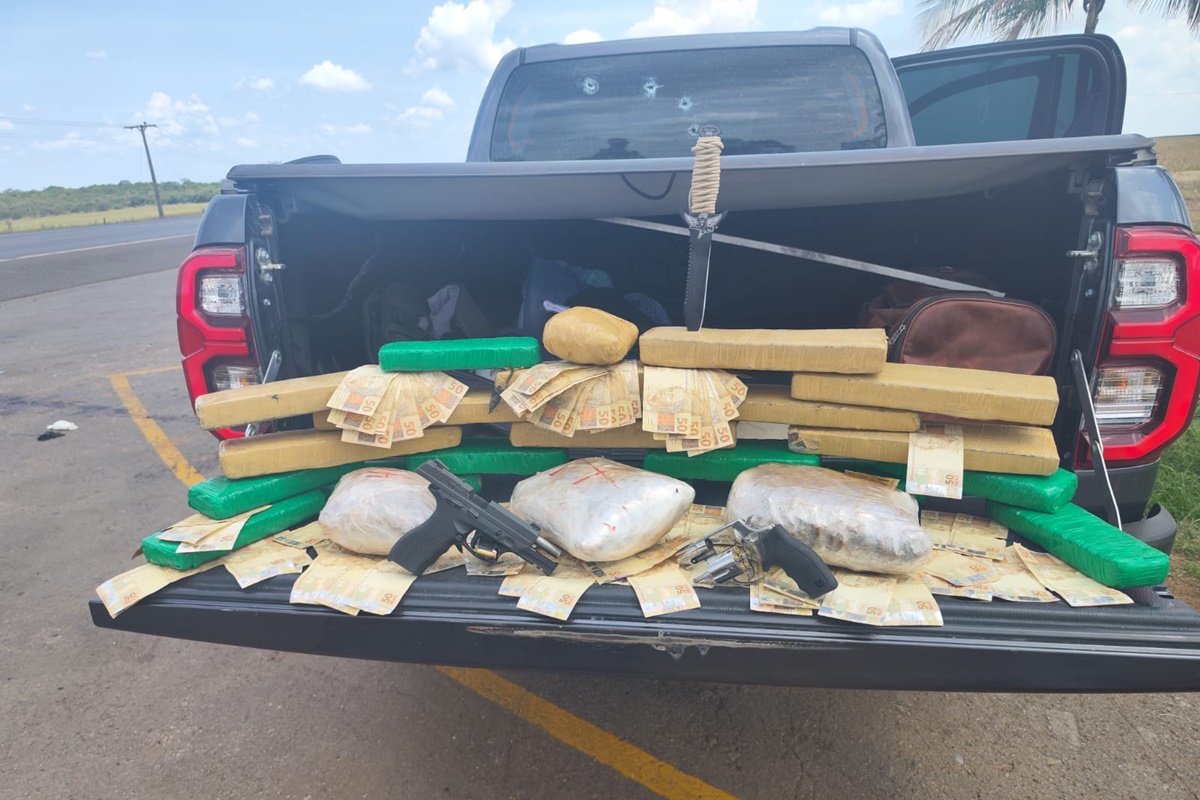 Na camionete em que os suspeitos estavam, foram apreendidas peças e porções de drogas, armas, e uma grande quantidade de dinheiro em espécie