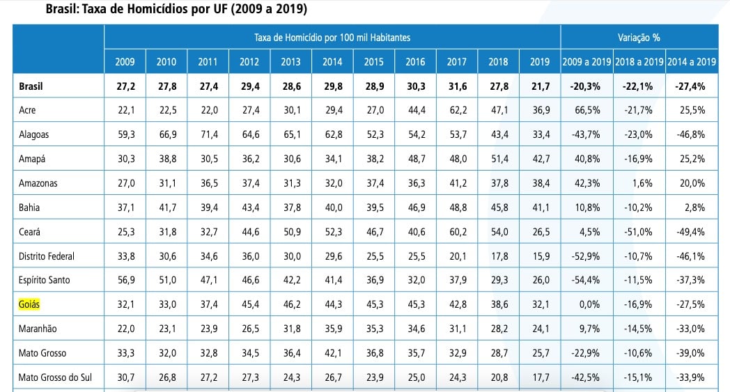 Porém, as taxas em Goiás seguem acima da média nacional. No Brasil houve queda de 20,3% entre 2009 a 2019. A taxa nacional de homicídios por 100 mil habitantes em 2009 foi de 27,2 e em 2019, foi de 21,7.