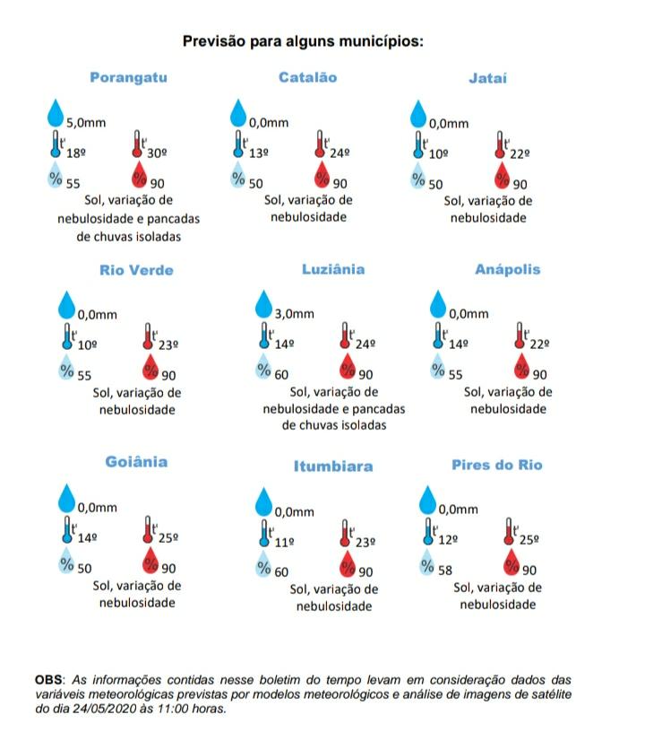 Segundo estudos da Cimehgo, na terça (26), quarta (27) e quinta-feira (28) o ar frio avançará mais sobre o estado, influenciando além da região Centro-Sul, áreas da região Norte. Na sexta, a massa de ar polar começa a perder força e gradativamente as temperaturas voltam ao normal.